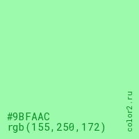 Цвет #9BFAAC в цветовой модели RGB обозначается тремя октетами (155, 250, 172) в десятичном формате и #9BFAAC в шестнадцатиричном (hex) формате, которые являются интенсивностью красного 155 (hex 9B), интенсивность зелёного 250 (hex FA) и интенсивность синего 172 (hex AC).