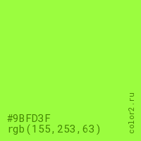 Цвет #9BFD3F в цветовой модели RGB обозначается тремя октетами (155, 253, 63) в десятичном формате и #9BFD3F в шестнадцатиричном (hex) формате, которые являются интенсивностью красного 155 (hex 9B), интенсивность зелёного 253 (hex FD) и интенсивность синего 63 (hex 3F).