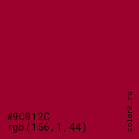 Цвет #9C012C в цветовой модели RGB обозначается тремя октетами (156, 1, 44) в десятичном формате и #9C012C в шестнадцатиричном (hex) формате, которые являются интенсивностью красного 156 (hex 9C), интенсивность зелёного 1 (hex 01) и интенсивность синего 44 (hex 2C).