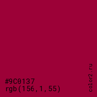 Цвет #9C0137 в цветовой модели RGB обозначается тремя октетами (156, 1, 55) в десятичном формате и #9C0137 в шестнадцатиричном (hex) формате, которые являются интенсивностью красного 156 (hex 9C), интенсивность зелёного 1 (hex 01) и интенсивность синего 55 (hex 37).