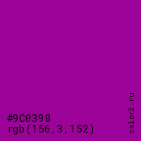 Цвет #9C0398 в цветовой модели RGB обозначается тремя октетами (156, 3, 152) в десятичном формате и #9C0398 в шестнадцатиричном (hex) формате, которые являются интенсивностью красного 156 (hex 9C), интенсивность зелёного 3 (hex 03) и интенсивность синего 152 (hex 98).
