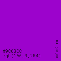 Цвет #9C03CC в цветовой модели RGB обозначается тремя октетами (156, 3, 204) в десятичном формате и #9C03CC в шестнадцатиричном (hex) формате, которые являются интенсивностью красного 156 (hex 9C), интенсивность зелёного 3 (hex 03) и интенсивность синего 204 (hex CC).