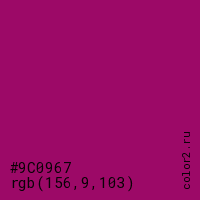 Цвет #9C0967 в цветовой модели RGB обозначается тремя октетами (156, 9, 103) в десятичном формате и #9C0967 в шестнадцатиричном (hex) формате, которые являются интенсивностью красного 156 (hex 9C), интенсивность зелёного 9 (hex 09) и интенсивность синего 103 (hex 67).