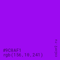Цвет #9C0AF1 в цветовой модели RGB обозначается тремя октетами (156, 10, 241) в десятичном формате и #9C0AF1 в шестнадцатиричном (hex) формате, которые являются интенсивностью красного 156 (hex 9C), интенсивность зелёного 10 (hex 0A) и интенсивность синего 241 (hex F1).