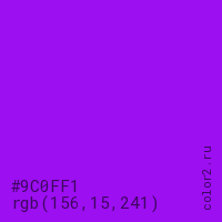 Цвет #9C0FF1 в цветовой модели RGB обозначается тремя октетами (156, 15, 241) в десятичном формате и #9C0FF1 в шестнадцатиричном (hex) формате, которые являются интенсивностью красного 156 (hex 9C), интенсивность зелёного 15 (hex 0F) и интенсивность синего 241 (hex F1).