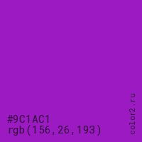 Цвет #9C1AC1 в цветовой модели RGB обозначается тремя октетами (156, 26, 193) в десятичном формате и #9C1AC1 в шестнадцатиричном (hex) формате, которые являются интенсивностью красного 156 (hex 9C), интенсивность зелёного 26 (hex 1A) и интенсивность синего 193 (hex C1).