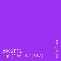 Цвет #9C2FF2 в цветовой модели RGB обозначается тремя октетами (156, 47, 242) в десятичном формате и #9C2FF2 в шестнадцатиричном (hex) формате, которые являются интенсивностью красного 156 (hex 9C), интенсивность зелёного 47 (hex 2F) и интенсивность синего 242 (hex F2).