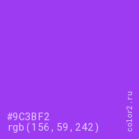 Цвет #9C3BF2 в цветовой модели RGB обозначается тремя октетами (156, 59, 242) в десятичном формате и #9C3BF2 в шестнадцатиричном (hex) формате, которые являются интенсивностью красного 156 (hex 9C), интенсивность зелёного 59 (hex 3B) и интенсивность синего 242 (hex F2).