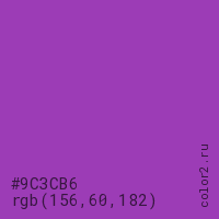 Цвет #9C3CB6 в цветовой модели RGB обозначается тремя октетами (156, 60, 182) в десятичном формате и #9C3CB6 в шестнадцатиричном (hex) формате, которые являются интенсивностью красного 156 (hex 9C), интенсивность зелёного 60 (hex 3C) и интенсивность синего 182 (hex B6).