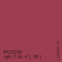 Цвет #9C3D50 в цветовой модели RGB обозначается тремя октетами (156, 61, 80) в десятичном формате и #9C3D50 в шестнадцатиричном (hex) формате, которые являются интенсивностью красного 156 (hex 9C), интенсивность зелёного 61 (hex 3D) и интенсивность синего 80 (hex 50).