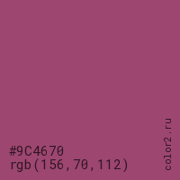 Цвет #9C4670 в цветовой модели RGB обозначается тремя октетами (156, 70, 112) в десятичном формате и #9C4670 в шестнадцатиричном (hex) формате, которые являются интенсивностью красного 156 (hex 9C), интенсивность зелёного 70 (hex 46) и интенсивность синего 112 (hex 70).