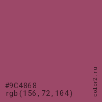 Цвет #9C4868 в цветовой модели RGB обозначается тремя октетами (156, 72, 104) в десятичном формате и #9C4868 в шестнадцатиричном (hex) формате, которые являются интенсивностью красного 156 (hex 9C), интенсивность зелёного 72 (hex 48) и интенсивность синего 104 (hex 68).
