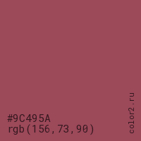 Цвет #9C495A в цветовой модели RGB обозначается тремя октетами (156, 73, 90) в десятичном формате и #9C495A в шестнадцатиричном (hex) формате, которые являются интенсивностью красного 156 (hex 9C), интенсивность зелёного 73 (hex 49) и интенсивность синего 90 (hex 5A).