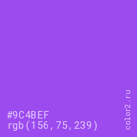 Цвет #9C4BEF в цветовой модели RGB обозначается тремя октетами (156, 75, 239) в десятичном формате и #9C4BEF в шестнадцатиричном (hex) формате, которые являются интенсивностью красного 156 (hex 9C), интенсивность зелёного 75 (hex 4B) и интенсивность синего 239 (hex EF).