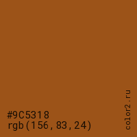 Цвет #9C5318 в цветовой модели RGB обозначается тремя октетами (156, 83, 24) в десятичном формате и #9C5318 в шестнадцатиричном (hex) формате, которые являются интенсивностью красного 156 (hex 9C), интенсивность зелёного 83 (hex 53) и интенсивность синего 24 (hex 18).