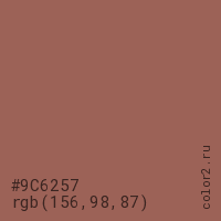 Цвет #9C6257 в цветовой модели RGB обозначается тремя октетами (156, 98, 87) в десятичном формате и #9C6257 в шестнадцатиричном (hex) формате, которые являются интенсивностью красного 156 (hex 9C), интенсивность зелёного 98 (hex 62) и интенсивность синего 87 (hex 57).