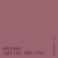 Цвет #9C646E в цветовой модели RGB обозначается тремя октетами (156, 100, 110) в десятичном формате и #9C646E в шестнадцатиричном (hex) формате, которые являются интенсивностью красного 156 (hex 9C), интенсивность зелёного 100 (hex 64) и интенсивность синего 110 (hex 6E).