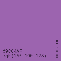 Цвет #9C64AF в цветовой модели RGB обозначается тремя октетами (156, 100, 175) в десятичном формате и #9C64AF в шестнадцатиричном (hex) формате, которые являются интенсивностью красного 156 (hex 9C), интенсивность зелёного 100 (hex 64) и интенсивность синего 175 (hex AF).