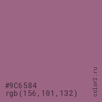 Цвет #9C6584 в цветовой модели RGB обозначается тремя октетами (156, 101, 132) в десятичном формате и #9C6584 в шестнадцатиричном (hex) формате, которые являются интенсивностью красного 156 (hex 9C), интенсивность зелёного 101 (hex 65) и интенсивность синего 132 (hex 84).