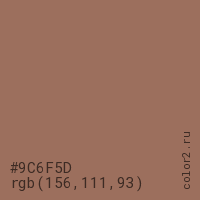 Цвет #9C6F5D в цветовой модели RGB обозначается тремя октетами (156, 111, 93) в десятичном формате и #9C6F5D в шестнадцатиричном (hex) формате, которые являются интенсивностью красного 156 (hex 9C), интенсивность зелёного 111 (hex 6F) и интенсивность синего 93 (hex 5D).