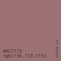 Цвет #9C7173 в цветовой модели RGB обозначается тремя октетами (156, 113, 115) в десятичном формате и #9C7173 в шестнадцатиричном (hex) формате, которые являются интенсивностью красного 156 (hex 9C), интенсивность зелёного 113 (hex 71) и интенсивность синего 115 (hex 73).