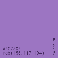 Цвет #9C75C2 в цветовой модели RGB обозначается тремя октетами (156, 117, 194) в десятичном формате и #9C75C2 в шестнадцатиричном (hex) формате, которые являются интенсивностью красного 156 (hex 9C), интенсивность зелёного 117 (hex 75) и интенсивность синего 194 (hex C2).