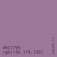 Цвет #9C7799 в цветовой модели RGB обозначается тремя октетами (156, 119, 153) в десятичном формате и #9C7799 в шестнадцатиричном (hex) формате, которые являются интенсивностью красного 156 (hex 9C), интенсивность зелёного 119 (hex 77) и интенсивность синего 153 (hex 99).