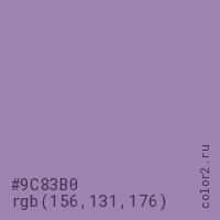 Цвет #9C83B0 в цветовой модели RGB обозначается тремя октетами (156, 131, 176) в десятичном формате и #9C83B0 в шестнадцатиричном (hex) формате, которые являются интенсивностью красного 156 (hex 9C), интенсивность зелёного 131 (hex 83) и интенсивность синего 176 (hex B0).
