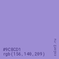 Цвет #9C8CD1 в цветовой модели RGB обозначается тремя октетами (156, 140, 209) в десятичном формате и #9C8CD1 в шестнадцатиричном (hex) формате, которые являются интенсивностью красного 156 (hex 9C), интенсивность зелёного 140 (hex 8C) и интенсивность синего 209 (hex D1).