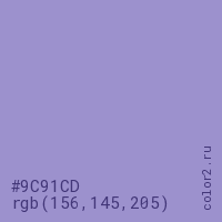 Цвет #9C91CD в цветовой модели RGB обозначается тремя октетами (156, 145, 205) в десятичном формате и #9C91CD в шестнадцатиричном (hex) формате, которые являются интенсивностью красного 156 (hex 9C), интенсивность зелёного 145 (hex 91) и интенсивность синего 205 (hex CD).