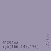 Цвет #9C93AA в цветовой модели RGB обозначается тремя октетами (156, 147, 170) в десятичном формате и #9C93AA в шестнадцатиричном (hex) формате, которые являются интенсивностью красного 156 (hex 9C), интенсивность зелёного 147 (hex 93) и интенсивность синего 170 (hex AA).