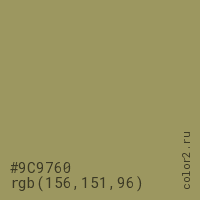 Цвет #9C9760 в цветовой модели RGB обозначается тремя октетами (156, 151, 96) в десятичном формате и #9C9760 в шестнадцатиричном (hex) формате, которые являются интенсивностью красного 156 (hex 9C), интенсивность зелёного 151 (hex 97) и интенсивность синего 96 (hex 60).
