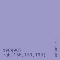 Цвет #9C99C7 в цветовой модели RGB обозначается тремя октетами (156, 153, 199) в десятичном формате и #9C99C7 в шестнадцатиричном (hex) формате, которые являются интенсивностью красного 156 (hex 9C), интенсивность зелёного 153 (hex 99) и интенсивность синего 199 (hex C7).