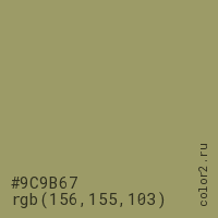 Цвет #9C9B67 в цветовой модели RGB обозначается тремя октетами (156, 155, 103) в десятичном формате и #9C9B67 в шестнадцатиричном (hex) формате, которые являются интенсивностью красного 156 (hex 9C), интенсивность зелёного 155 (hex 9B) и интенсивность синего 103 (hex 67).