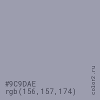 Цвет #9C9DAE в цветовой модели RGB обозначается тремя октетами (156, 157, 174) в десятичном формате и #9C9DAE в шестнадцатиричном (hex) формате, которые являются интенсивностью красного 156 (hex 9C), интенсивность зелёного 157 (hex 9D) и интенсивность синего 174 (hex AE).