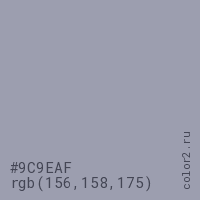 Цвет #9C9EAF в цветовой модели RGB обозначается тремя октетами (156, 158, 175) в десятичном формате и #9C9EAF в шестнадцатиричном (hex) формате, которые являются интенсивностью красного 156 (hex 9C), интенсивность зелёного 158 (hex 9E) и интенсивность синего 175 (hex AF).