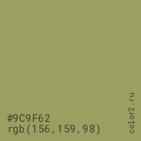 Цвет #9C9F62 в цветовой модели RGB обозначается тремя октетами (156, 159, 98) в десятичном формате и #9C9F62 в шестнадцатиричном (hex) формате, которые являются интенсивностью красного 156 (hex 9C), интенсивность зелёного 159 (hex 9F) и интенсивность синего 98 (hex 62).