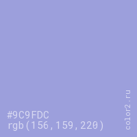 Цвет RGB(156, 159, 220) в процентом отношении количества цвета состоит из 61.2% красного (red), 62.4% зелёного (green) и 86.3% синего (blue).