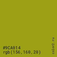 Цвет #9CA014 в цветовой модели RGB обозначается тремя октетами (156, 160, 20) в десятичном формате и #9CA014 в шестнадцатиричном (hex) формате, которые являются интенсивностью красного 156 (hex 9C), интенсивность зелёного 160 (hex A0) и интенсивность синего 20 (hex 14).