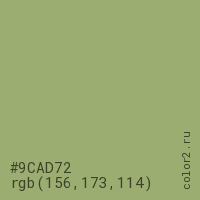 Цвет #9CAD72 в цветовой модели RGB обозначается тремя октетами (156, 173, 114) в десятичном формате и #9CAD72 в шестнадцатиричном (hex) формате, которые являются интенсивностью красного 156 (hex 9C), интенсивность зелёного 173 (hex AD) и интенсивность синего 114 (hex 72).