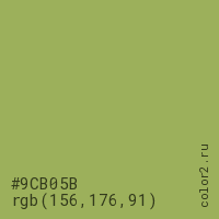 Цвет #9CB05B в цветовой модели RGB обозначается тремя октетами (156, 176, 91) в десятичном формате и #9CB05B в шестнадцатиричном (hex) формате, которые являются интенсивностью красного 156 (hex 9C), интенсивность зелёного 176 (hex B0) и интенсивность синего 91 (hex 5B).