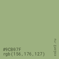 Цвет #9CB07F в цветовой модели RGB обозначается тремя октетами (156, 176, 127) в десятичном формате и #9CB07F в шестнадцатиричном (hex) формате, которые являются интенсивностью красного 156 (hex 9C), интенсивность зелёного 176 (hex B0) и интенсивность синего 127 (hex 7F).