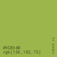 Цвет #9CB64B в цветовой модели RGB обозначается тремя октетами (156, 182, 75) в десятичном формате и #9CB64B в шестнадцатиричном (hex) формате, которые являются интенсивностью красного 156 (hex 9C), интенсивность зелёного 182 (hex B6) и интенсивность синего 75 (hex 4B).