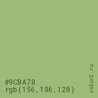 Цвет #9CBA78 в цветовой модели RGB обозначается тремя октетами (156, 186, 120) в десятичном формате и #9CBA78 в шестнадцатиричном (hex) формате, которые являются интенсивностью красного 156 (hex 9C), интенсивность зелёного 186 (hex BA) и интенсивность синего 120 (hex 78).