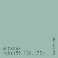 Цвет #9CBAAF в цветовой модели RGB обозначается тремя октетами (156, 186, 175) в десятичном формате и #9CBAAF в шестнадцатиричном (hex) формате, которые являются интенсивностью красного 156 (hex 9C), интенсивность зелёного 186 (hex BA) и интенсивность синего 175 (hex AF).