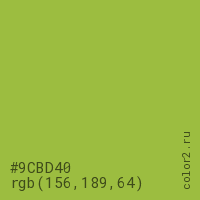 Цвет #9CBD40 в цветовой модели RGB обозначается тремя октетами (156, 189, 64) в десятичном формате и #9CBD40 в шестнадцатиричном (hex) формате, которые являются интенсивностью красного 156 (hex 9C), интенсивность зелёного 189 (hex BD) и интенсивность синего 64 (hex 40).