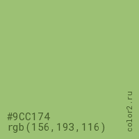 Цвет #9CC174 в цветовой модели RGB обозначается тремя октетами (156, 193, 116) в десятичном формате и #9CC174 в шестнадцатиричном (hex) формате, которые являются интенсивностью красного 156 (hex 9C), интенсивность зелёного 193 (hex C1) и интенсивность синего 116 (hex 74).