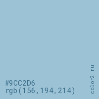 Цвет #9CC2D6 в цветовой модели RGB обозначается тремя октетами (156, 194, 214) в десятичном формате и #9CC2D6 в шестнадцатиричном (hex) формате, которые являются интенсивностью красного 156 (hex 9C), интенсивность зелёного 194 (hex C2) и интенсивность синего 214 (hex D6).