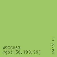 Цвет #9CC663 в цветовой модели RGB обозначается тремя октетами (156, 198, 99) в десятичном формате и #9CC663 в шестнадцатиричном (hex) формате, которые являются интенсивностью красного 156 (hex 9C), интенсивность зелёного 198 (hex C6) и интенсивность синего 99 (hex 63).