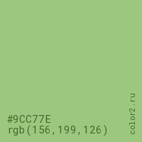 Цвет #9CC77E в цветовой модели RGB обозначается тремя октетами (156, 199, 126) в десятичном формате и #9CC77E в шестнадцатиричном (hex) формате, которые являются интенсивностью красного 156 (hex 9C), интенсивность зелёного 199 (hex C7) и интенсивность синего 126 (hex 7E).